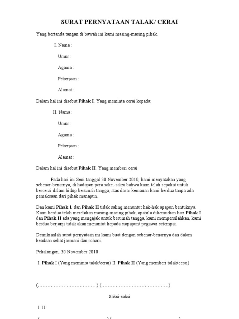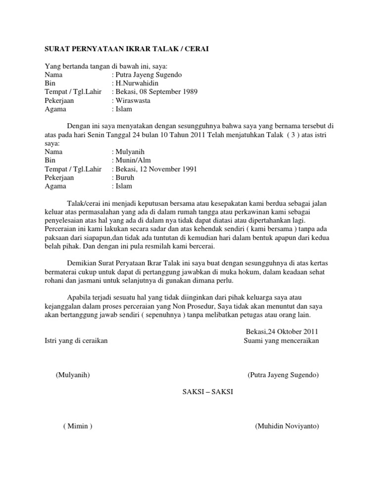 Pdf contoh form permohonan cerai talak muhammad joko. Okki tempat/ t juanda agama : Pada postingan kali ini saya ingin memberikan satu contoh mengenai surat pernyataan ikrar talak, sebenarnya saya malas memberikan contoh surat yang satu ini, maklum masalah talak mentalak kalau bisa dihindari selama masih bisa dilakukan dengan jalan damai antara suami. Pada kesempatan kali ini sc akan memberikan contoh tentang pembuatan surat pernyataan ikrar talak, langsung saja berikut ini sc tampilkan dan bisa di download contoh surat pernyataan ikror thalak. Indonesia saya sebagai pihak pertama menyatakan ikrar talak kepada pihak kedua mulai saat ini saya.